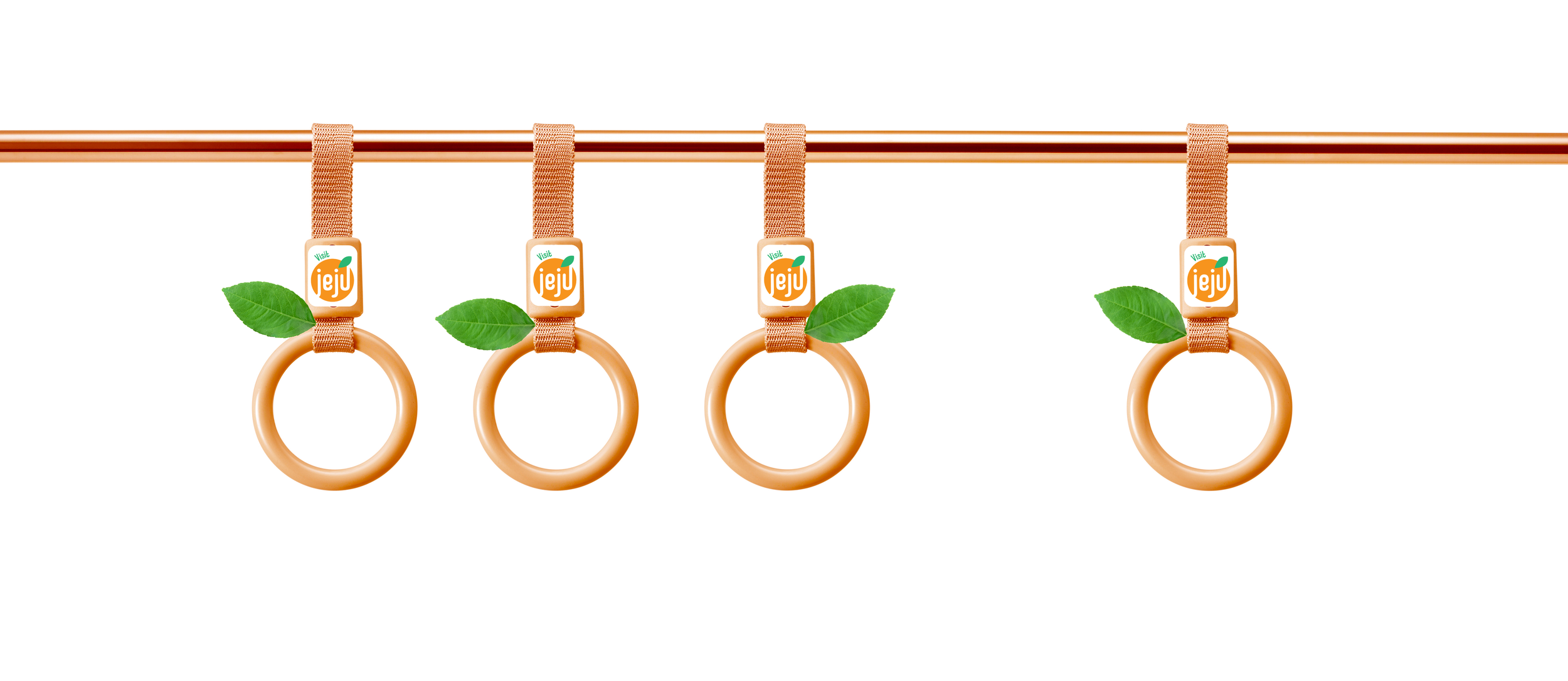 For my art direction class, we needed to invent an ambient ad that would mesh with an existing landscape or object. While brainstorming, I realized many buses and subways have round handles, round like oranges! So I decided to turn those handles into Jeju oranges by hanging leaves and stickers promoting the island.